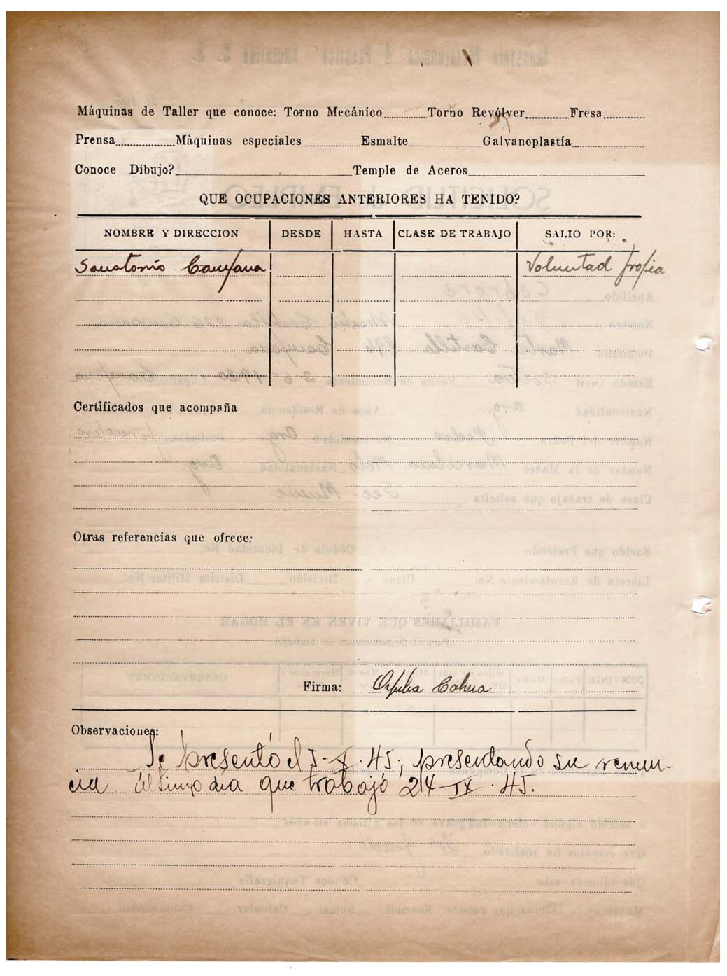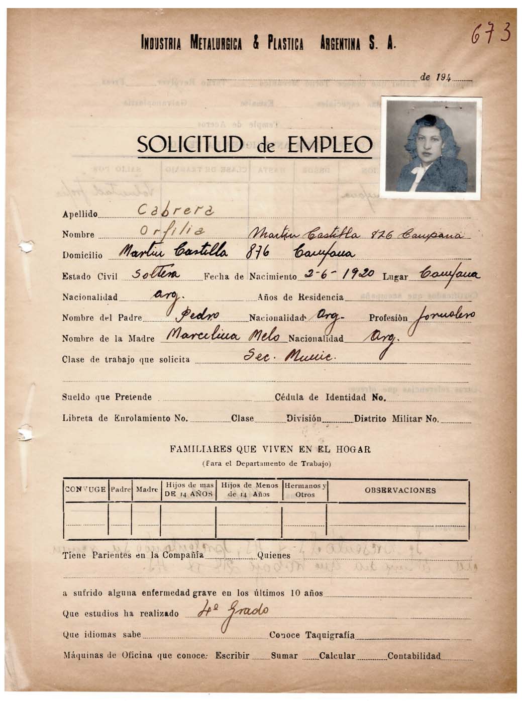 FECHA DE NACIMIENTO: 02/06/1920. EDAD AL INGRESO: 24 años. SEDE: San Martín. ÁREA DE TRABAJO: Munición. FECHA DE EGRESO: 31/12/1947. NACIONALIDAD: argentina. SUELDO INICIAL: 0,30 por hora. ESTADO CIVIL: Soltera. ESTUDIOS: 4º grado. EMPRESA ANTERIOR: Sanatorio Campana.