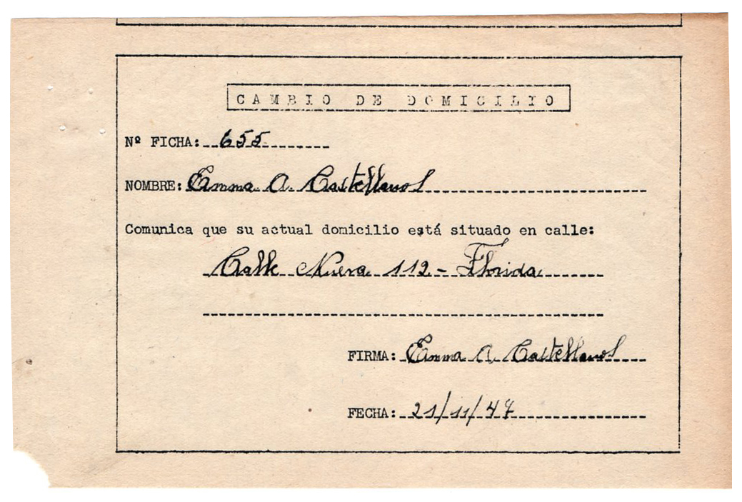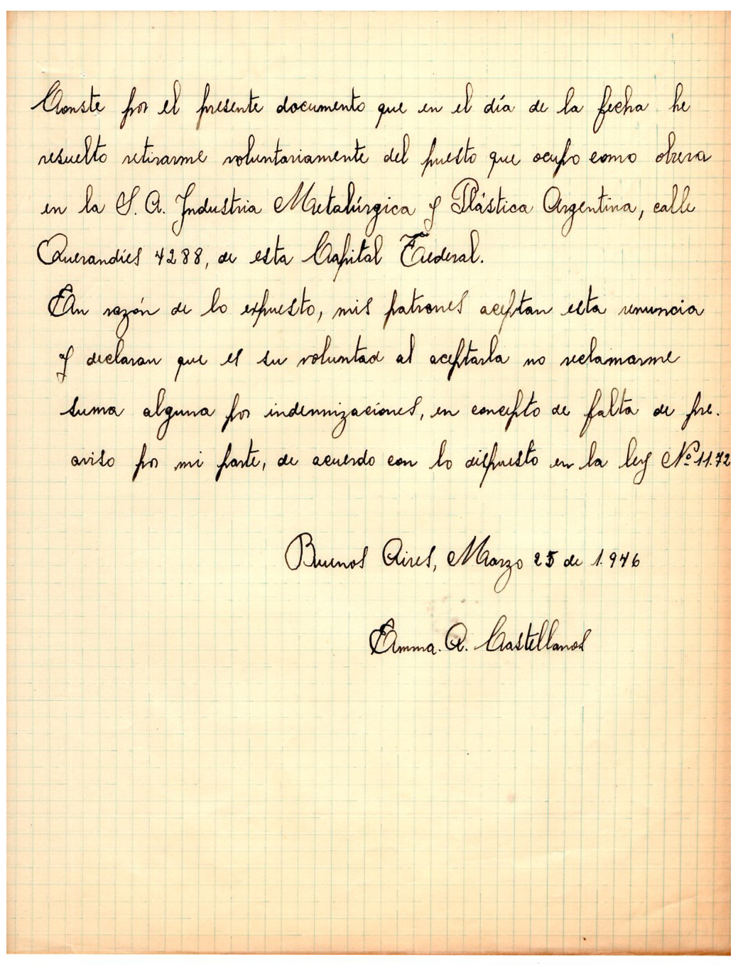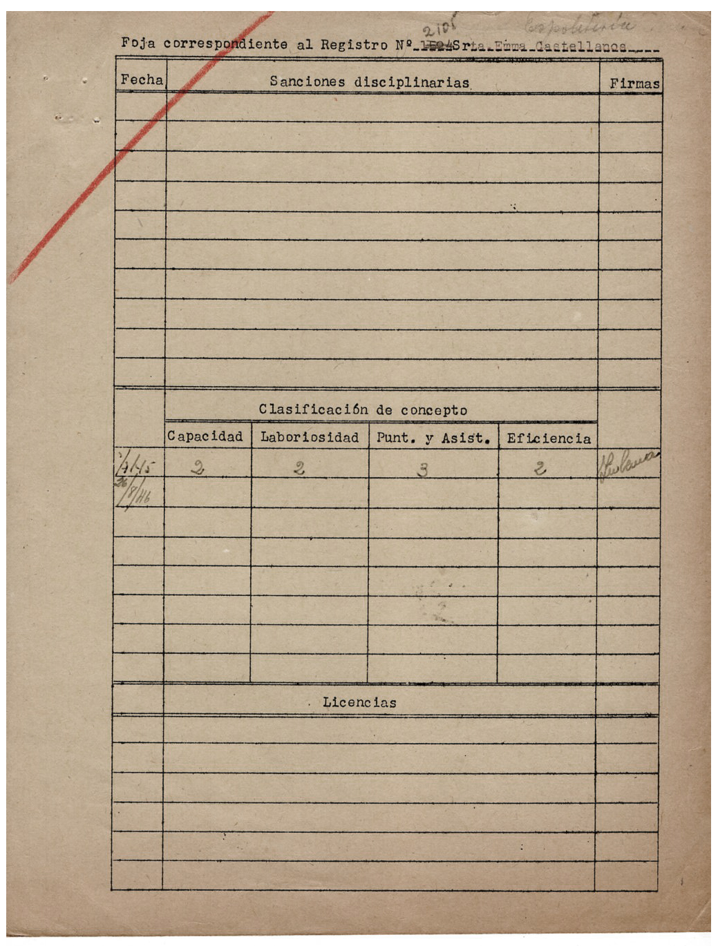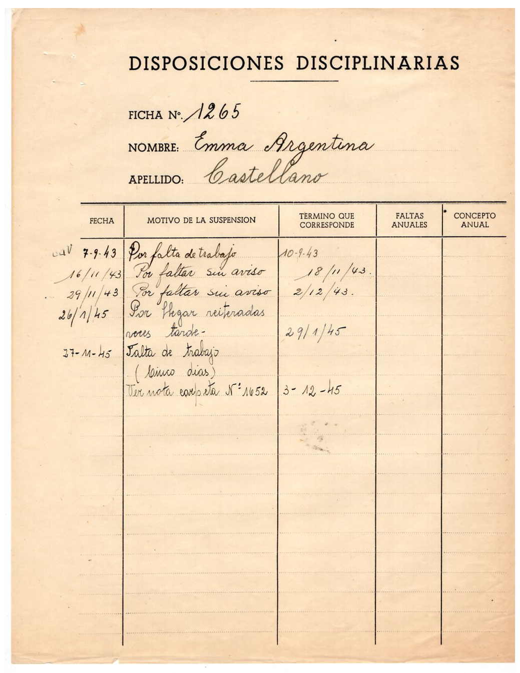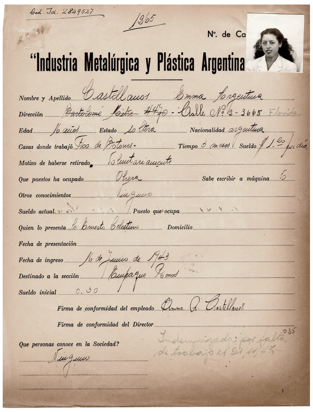 FECHA DE NACIMIENTO: 1927. EDAD AL INGRESO: 16 años. SEDE: Querandíes. ÁREA DE TRABAJO: Empaque de pomos. FECHA DE EGRESO: 21/11/1947. NACIONALIDAD: argentina. SUELDO INICIAL: 0,30 por hora. ESTADO CIVIL: Soltera. ESTUDIOS: Primarios. EMPRESA ANTERIOR: Fábrica de botones.