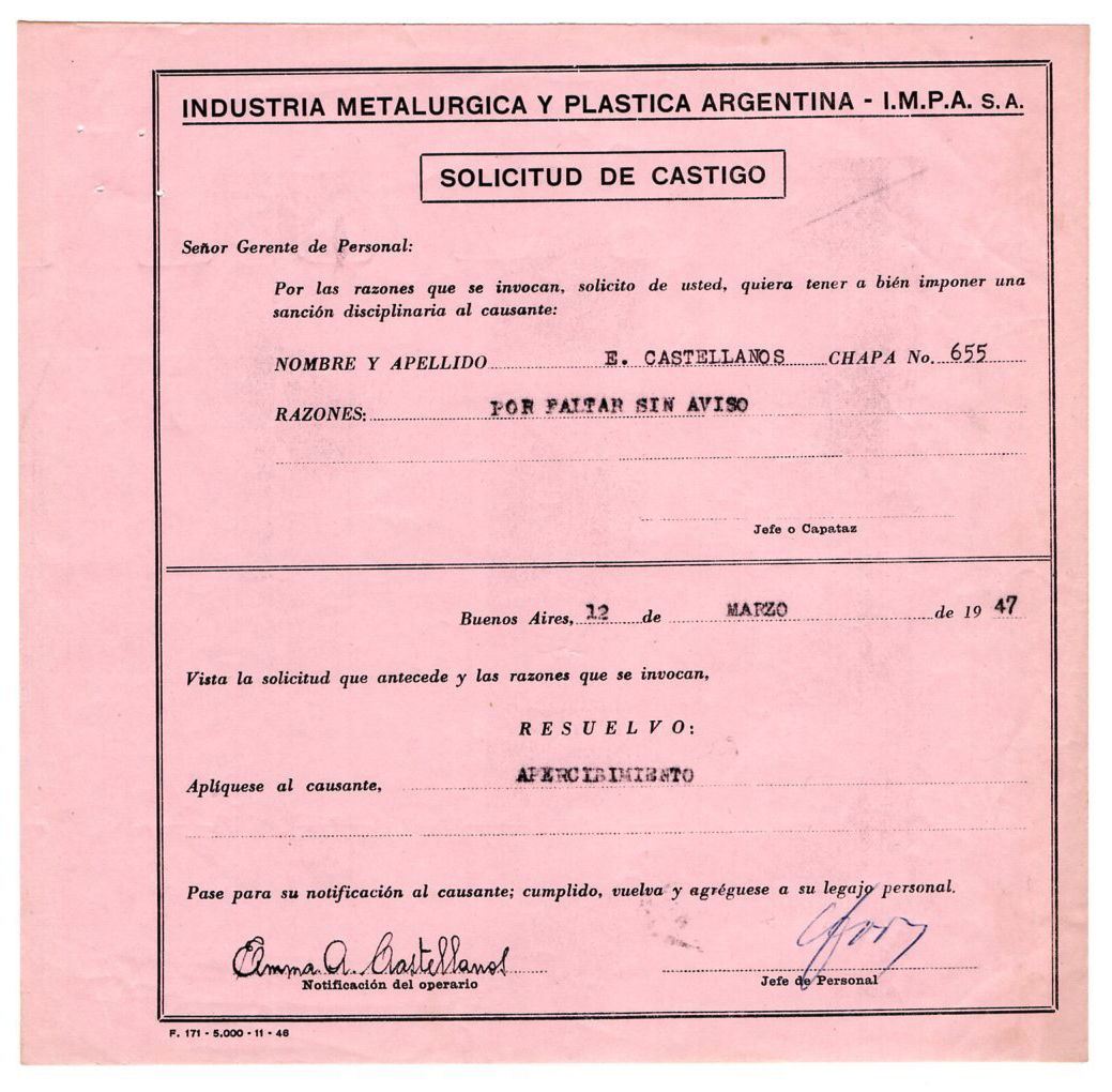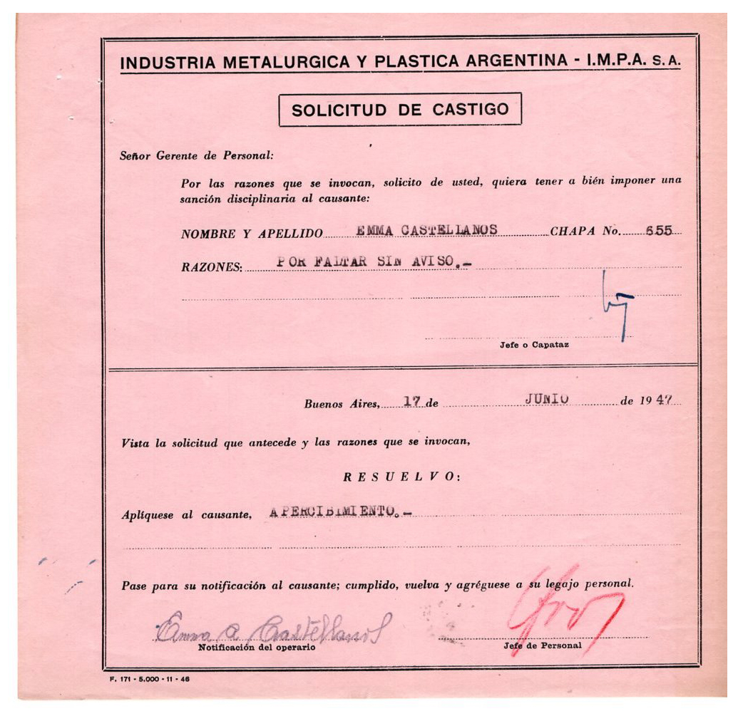 Emma Castellanos trabajó como obrera de la fábrica IMPA durante la Etapa 1 de empresa privada (1928-1945) y Etapa 2 (1946-1960) empresa estatal.