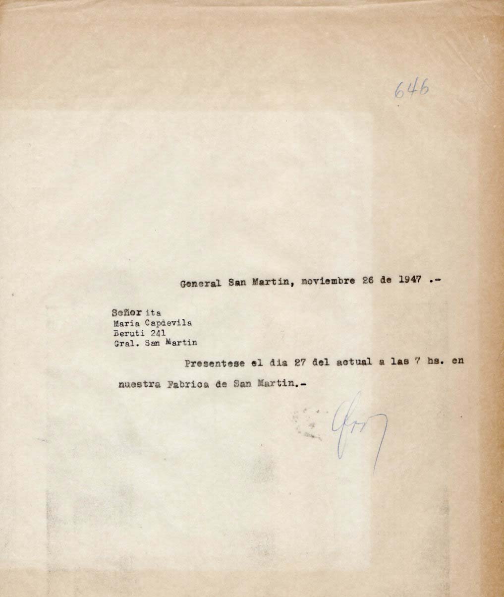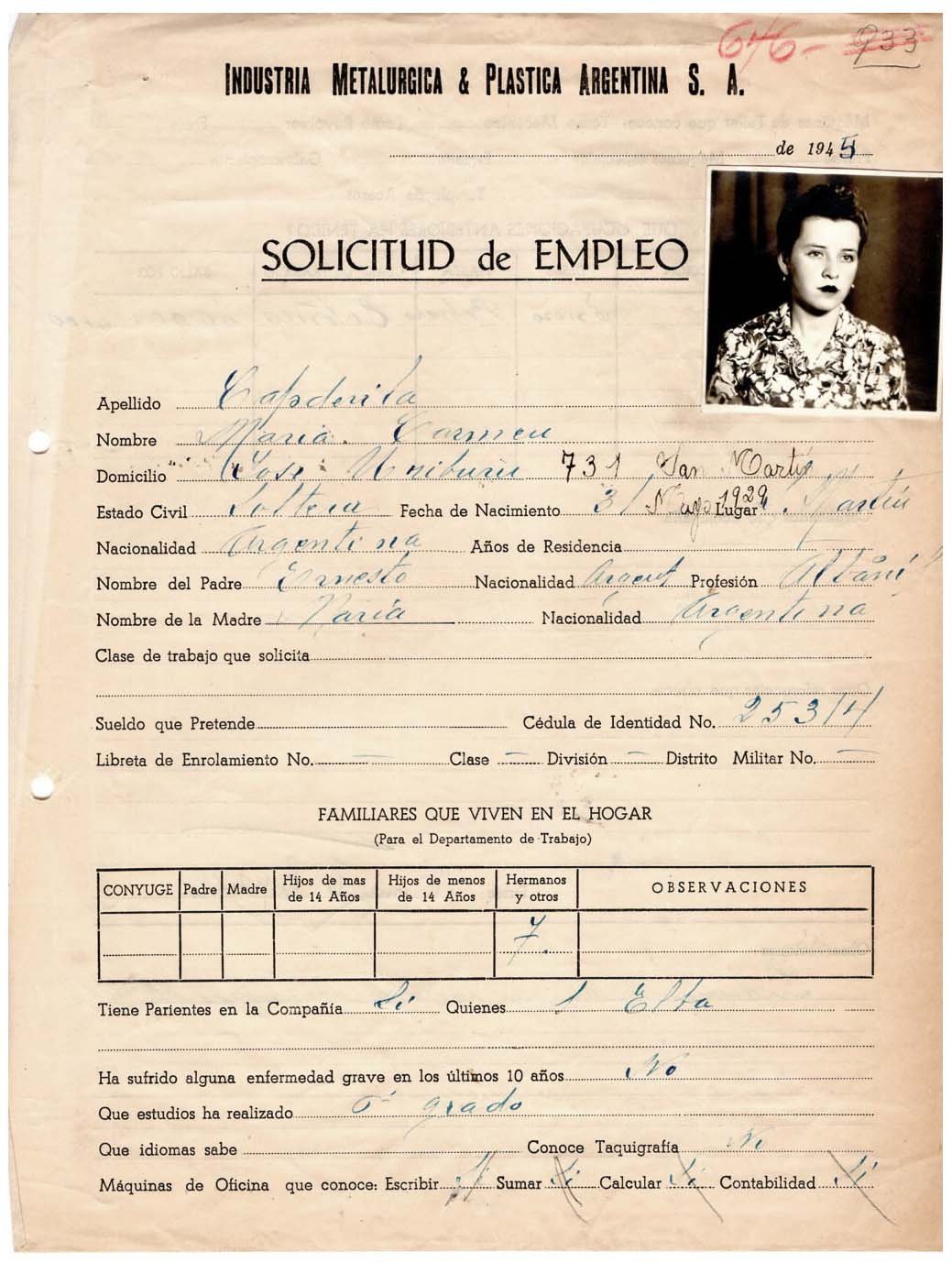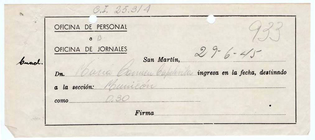 FECHA DE NACIMIENTO: 03/05/1929. EDAD AL INGRESO: 16 años. SEDE: San Martín. ÁREA DE TRABAJO: Munición. FECHA DE EGRESO: 22/01/1948. NACIONALIDAD: argentina. SUELDO INICIAL: 0,30 por hora. ESTADO CIVIL: Soltera. ESTUDIOS: Primarios. EMPRESA ANTERIOR: Fábrica de botones RABINI.
