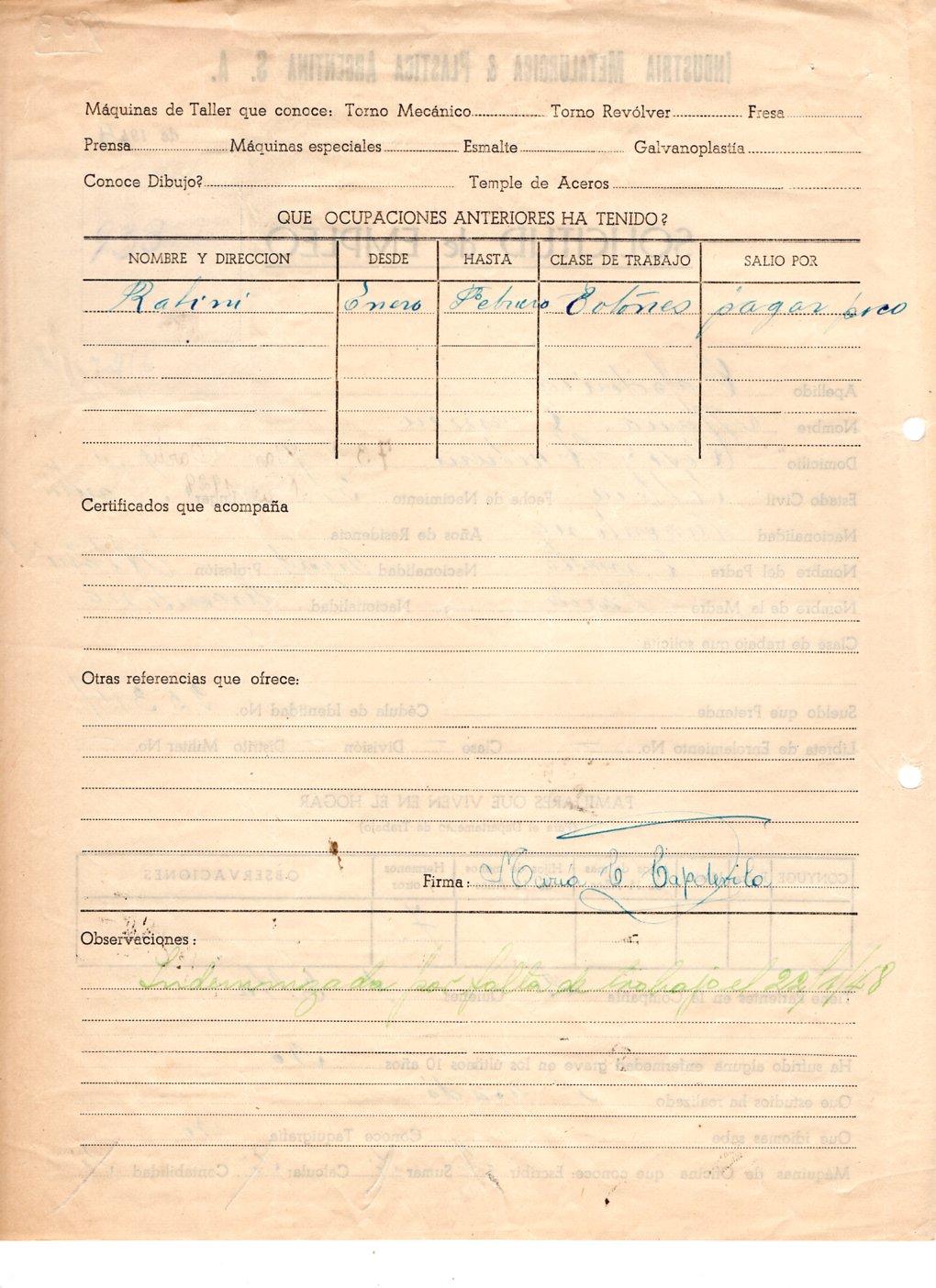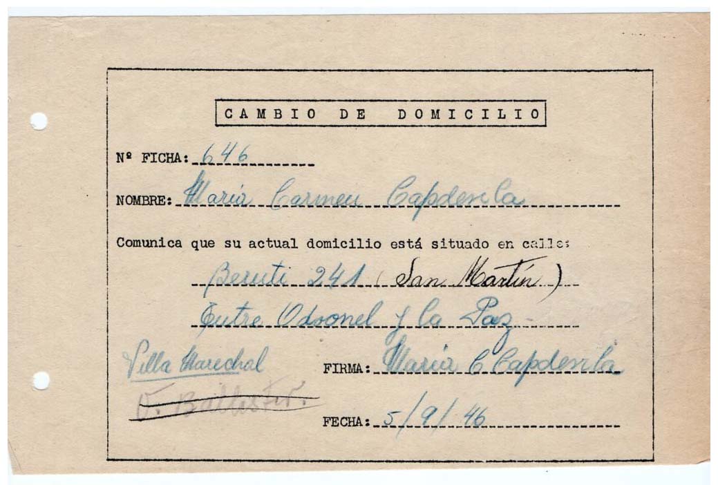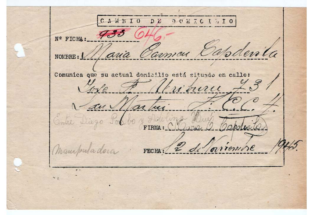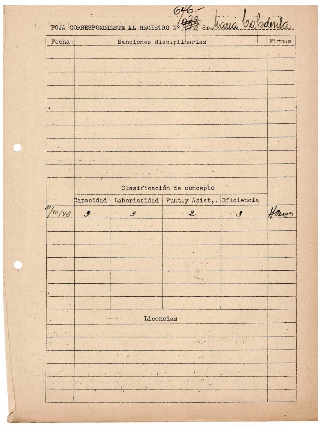 FECHA DE NACIMIENTO: 03/05/1929. EDAD AL INGRESO: 16 años. SEDE: San Martín. ÁREA DE TRABAJO: Munición. FECHA DE EGRESO: 22/01/1948. NACIONALIDAD: argentina. SUELDO INICIAL: 0,30 por hora. ESTADO CIVIL: Soltera. ESTUDIOS: Primarios. EMPRESA ANTERIOR: Fábrica de botones RABINI.