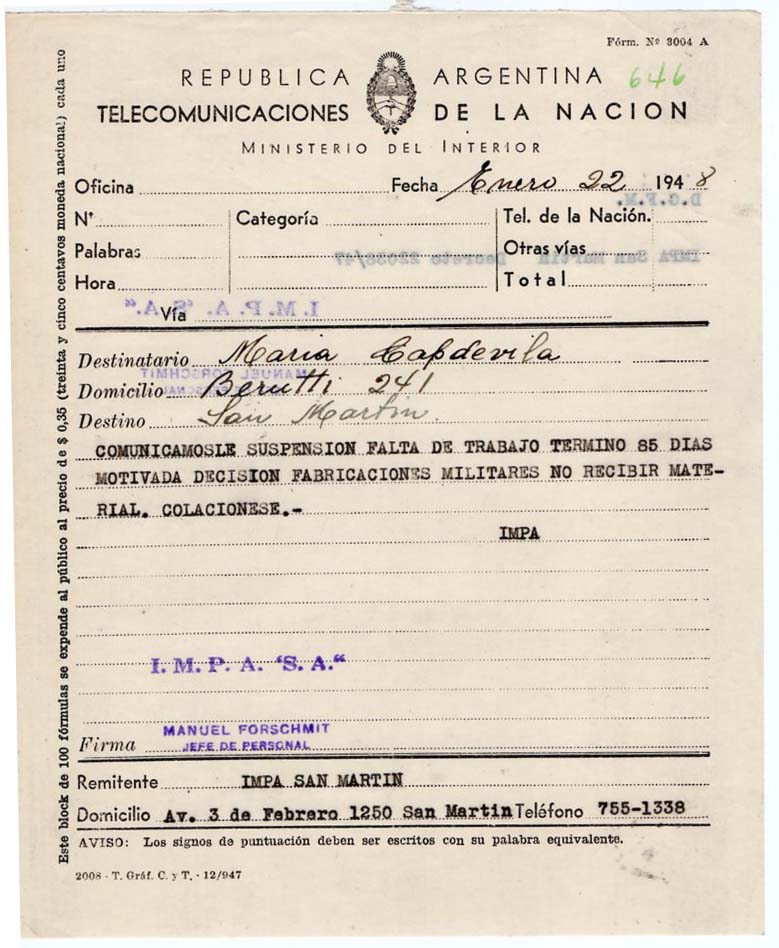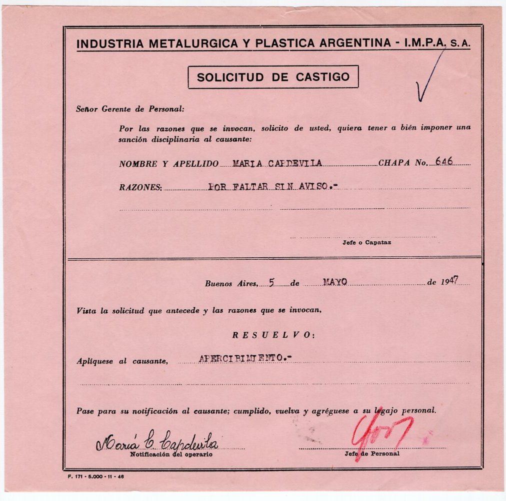 María Carmen Capdevila trabajó como obrera de la fábrica IMPA durante la Etapa 1 de empresa privada (1928-1945) y Etapa 2 (1946-1960) empresa estatal.