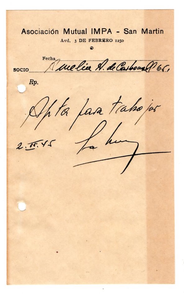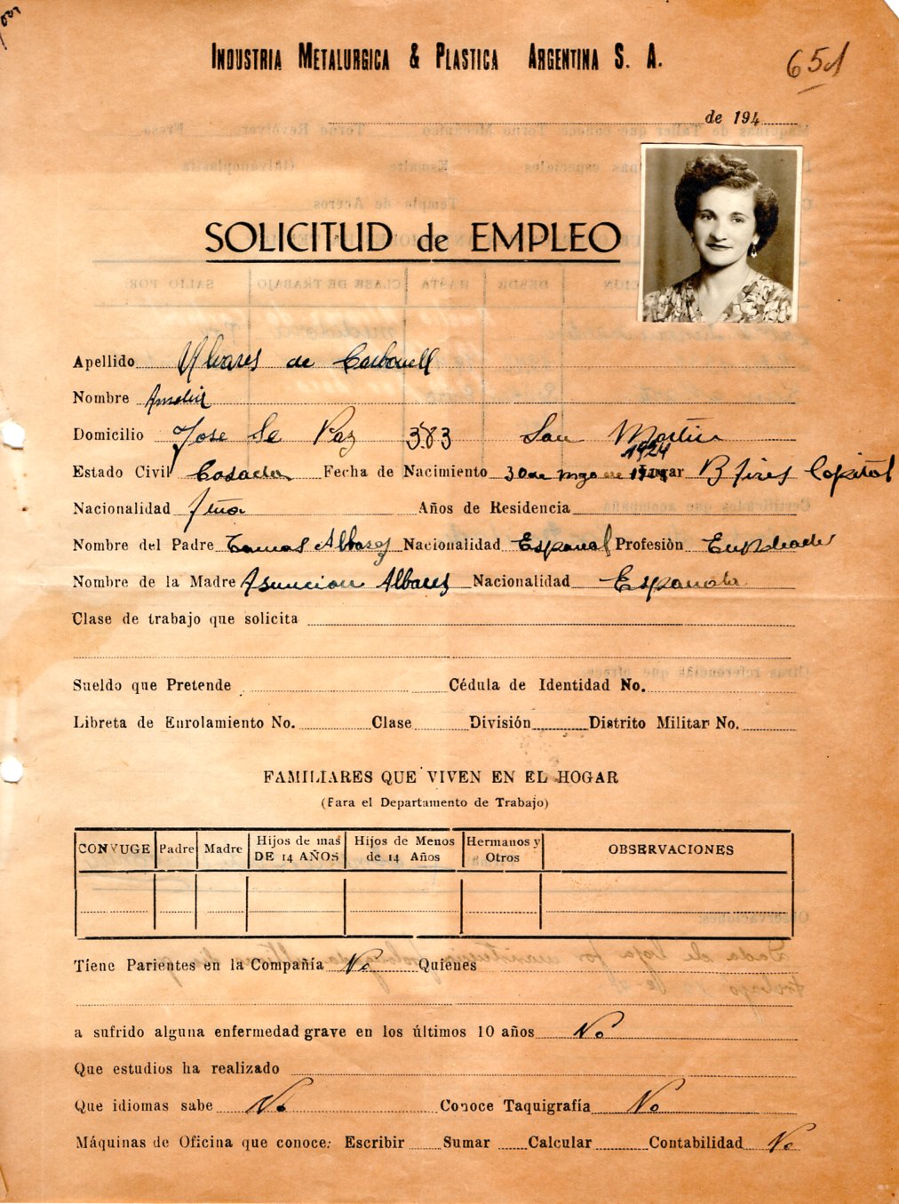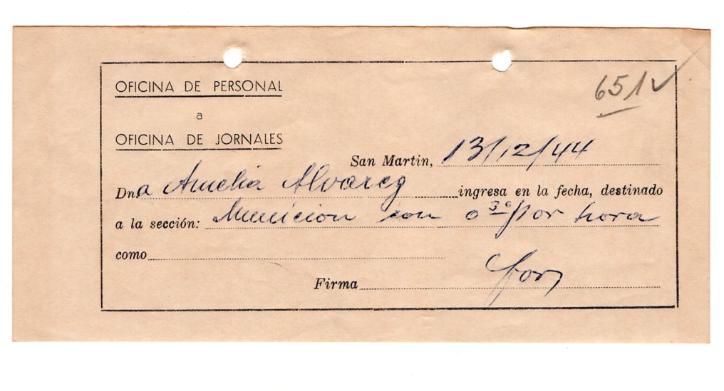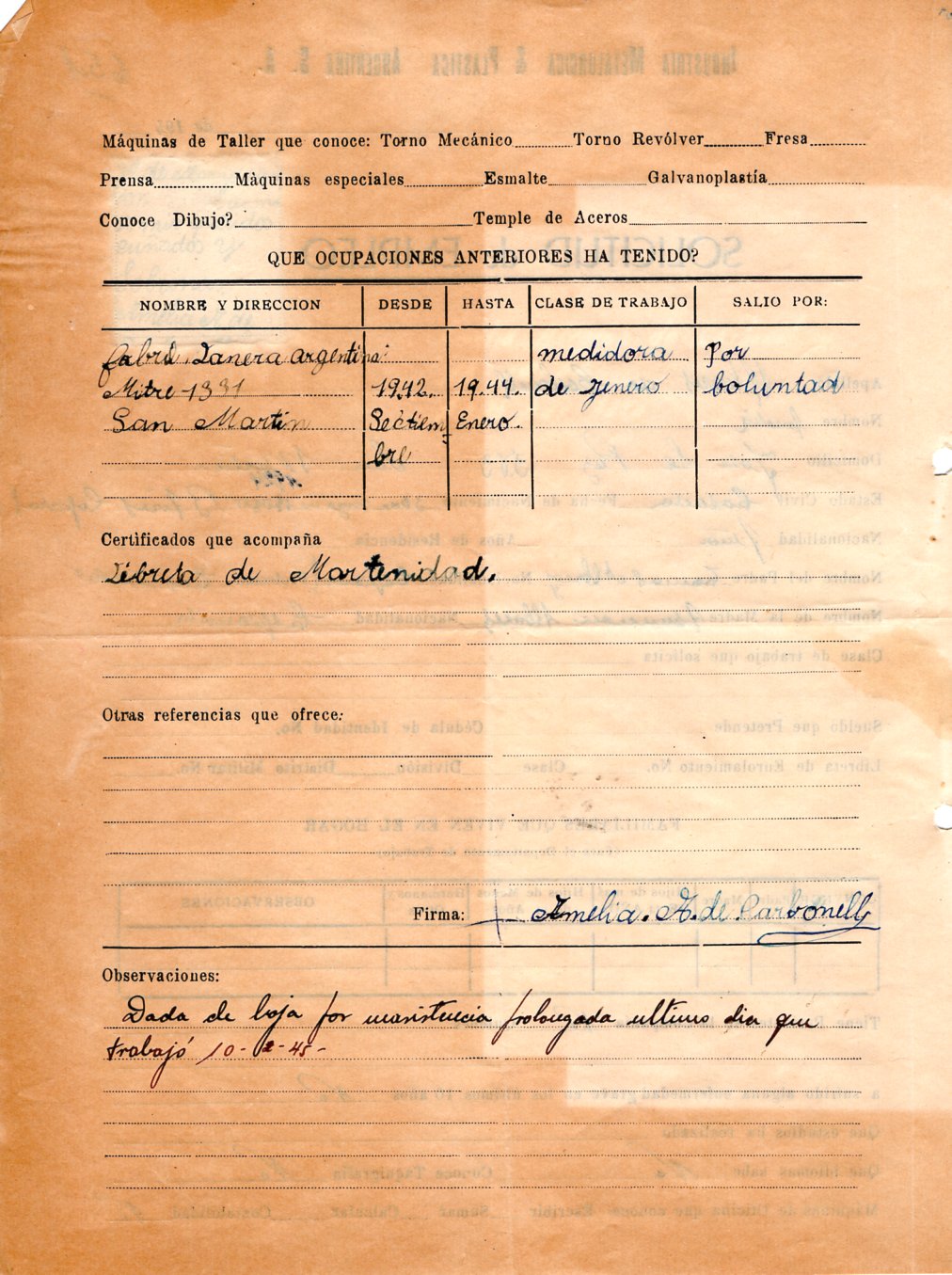 FECHA DE NACIMIENTO: 30/03/1924. EDAD AL INGRESO: 20 años. SEDE: IMPA San Martín. ÁREA DE TRABAJO: Munición. FECHA DE EGRESO: 10/02/1945. NACIONALIDAD: Española. SUELDO INICIAL: 0,30 por hora. ESTADO CIVIL : Casada. ESTUDIOS: Sin mención. EMPRESA ANTERIOR: Lanera Argentina (Medidora de género)