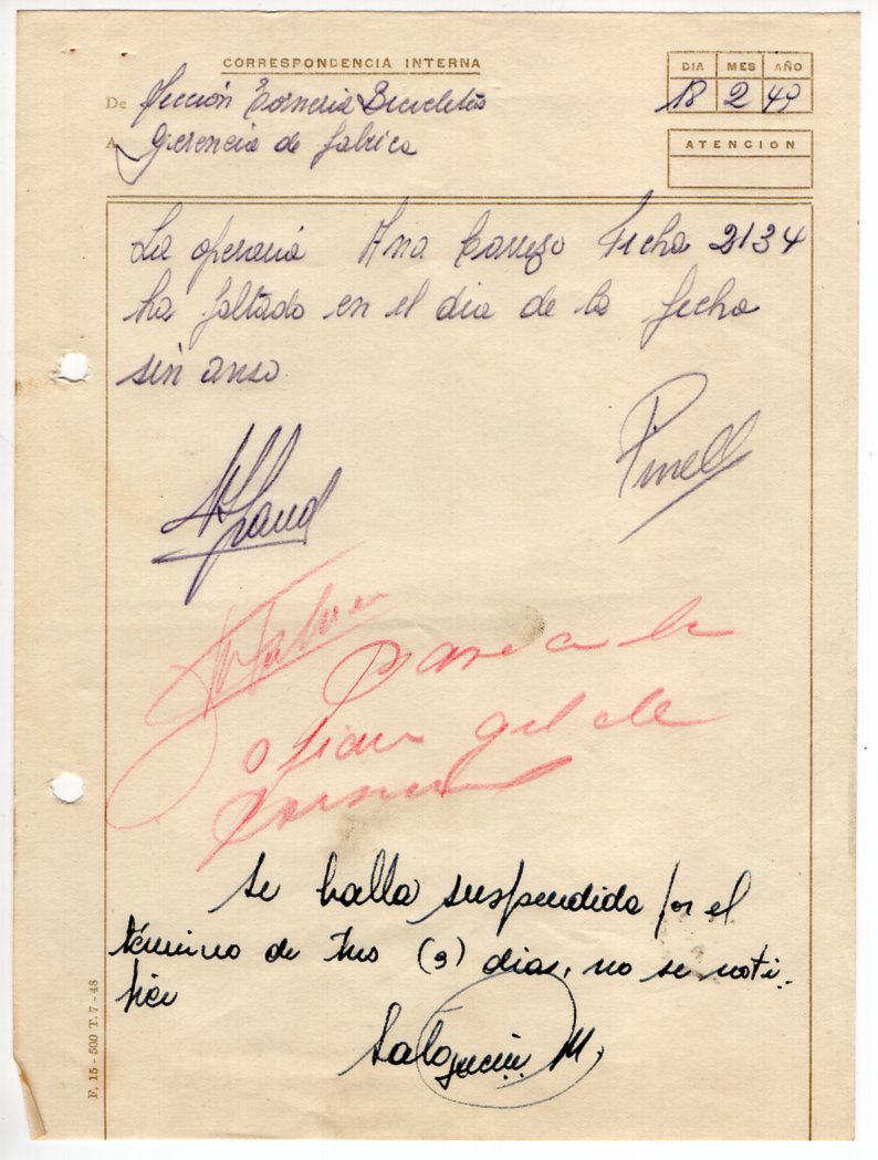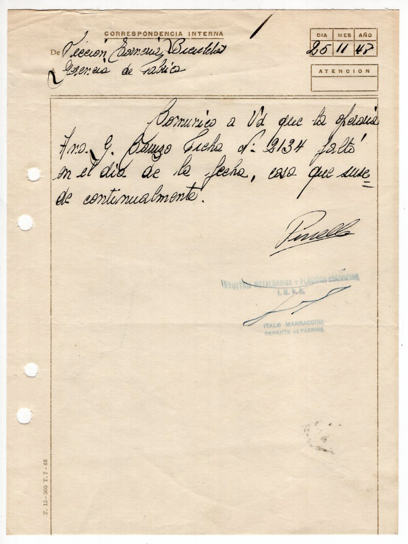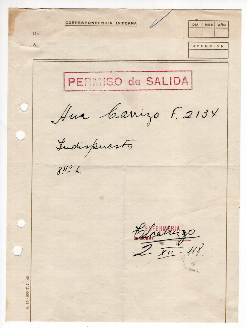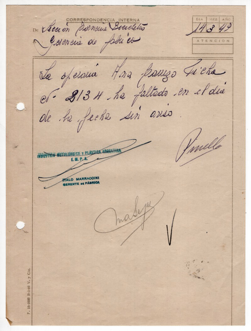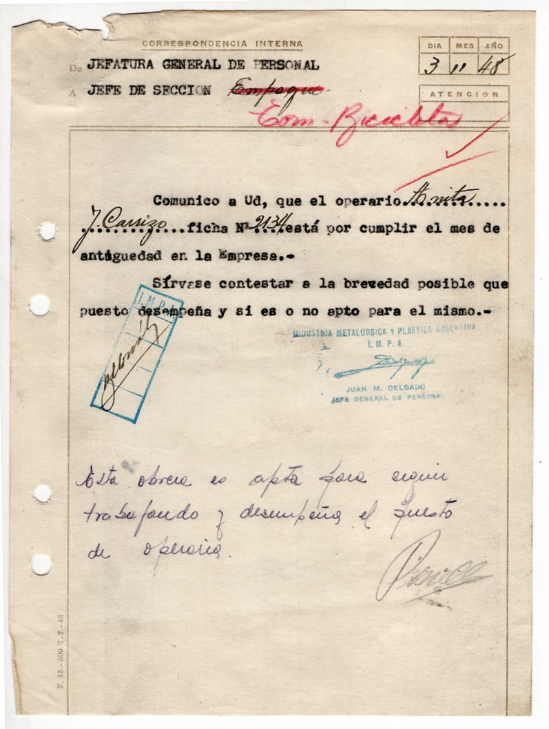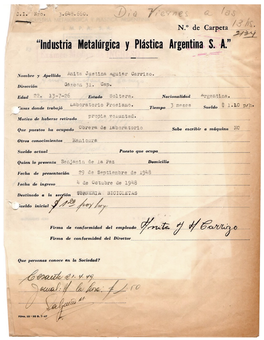 FECHA DE NACIMIENTO: 13/07/1926. EDAD AL INGRESO: 22 años. SEDE: Querandíes. ÁREA DE TRABAJO: Tornería Bicicletas. FECHA DE EGRESO: 21/04/1949. NACIONALIDAD: argentina. SUELDO INICIAL: 1,20 por hora. ESTADO CIVIL: Soltera. ESTUDIOS: Sin mención. EMPRESA ANTERIOR: Laboratorio Prosiano (Operaria).