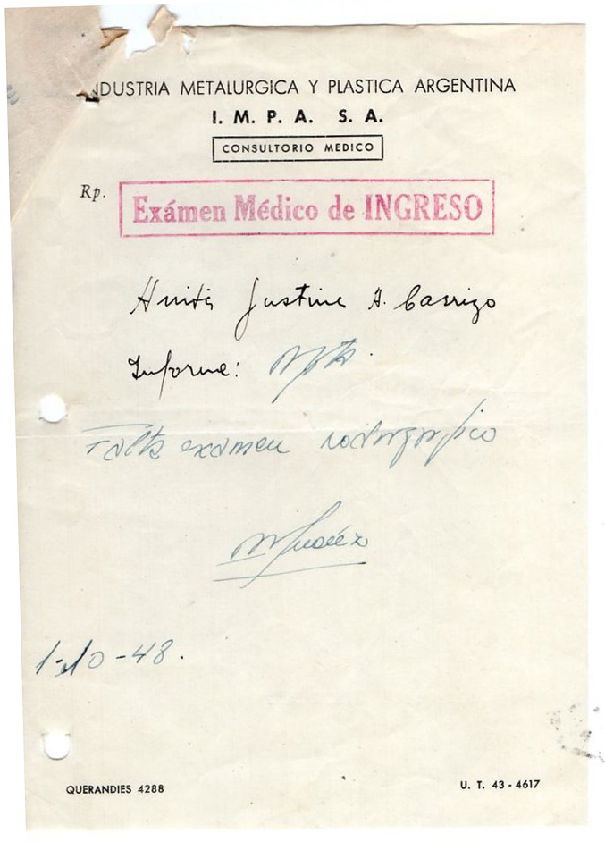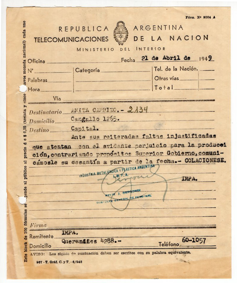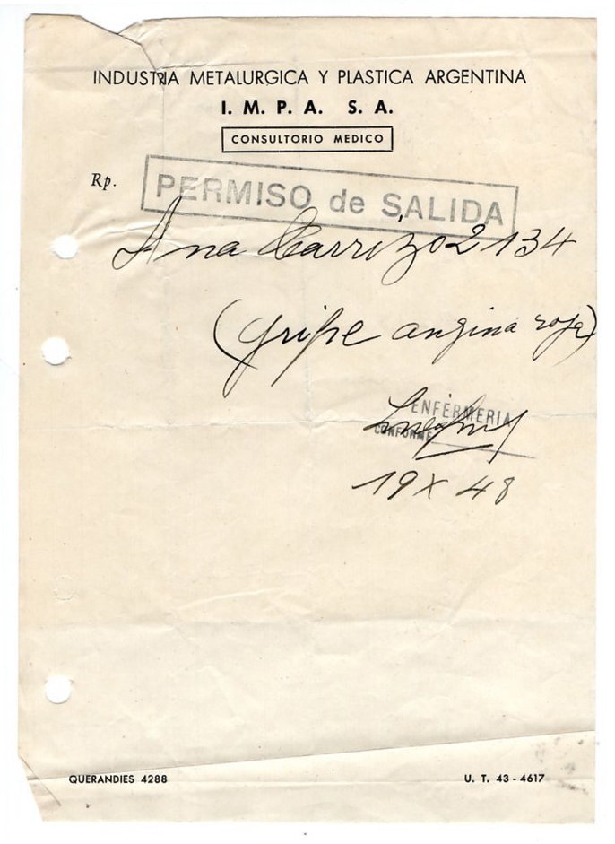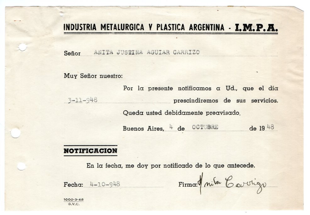 Anita Justina Aguiar Carrizo trabajó como obrera de la fábrica IMPA durante la Etapa 2 de empresa estatal (1946-1960).