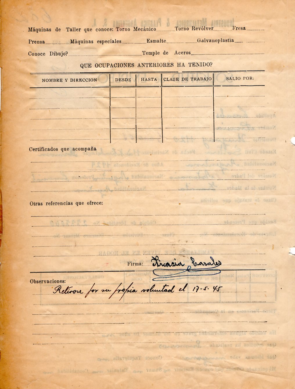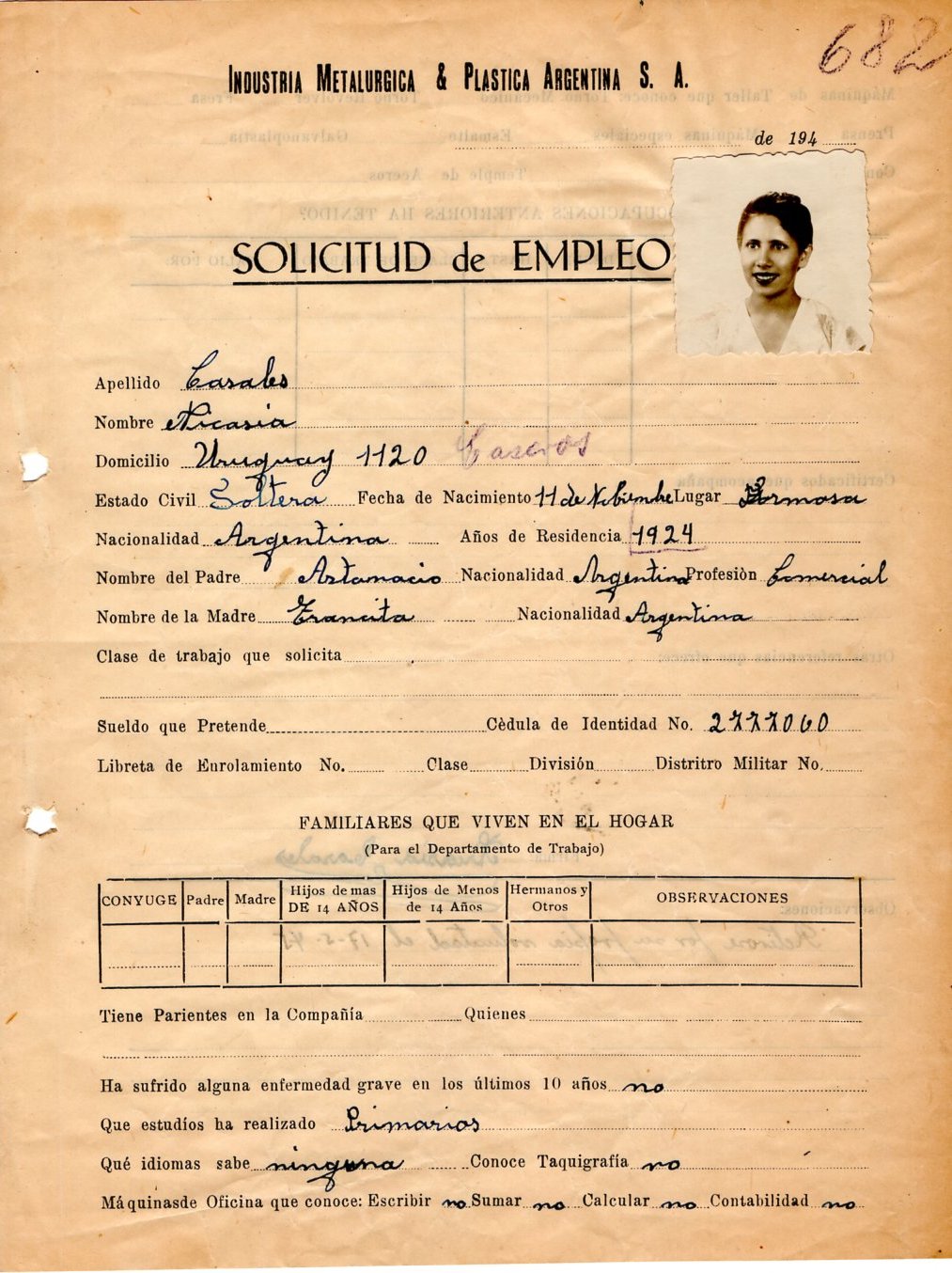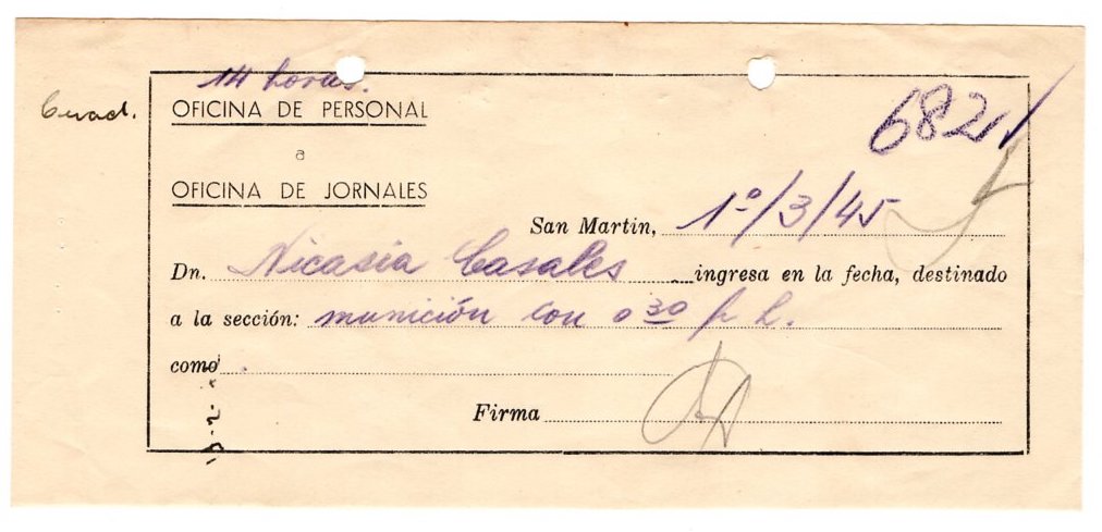FECHA DE NACIMIENTO: 11/11/1924 (Formosa). EDAD AL INGRESO: 21 años. SEDE: IMPA San Martín. ÁREA DE TRABAJO: Munición. FECHA DE EGRESO: 17/05/1945. NACIONALIDAD: Argentina. SUELDO INICIAL: 0,30 por hora. ESTADO CIVIL: Soltera. ESTUDIOS: Primarios. EMPRESA ANTERIOR: Sin mención