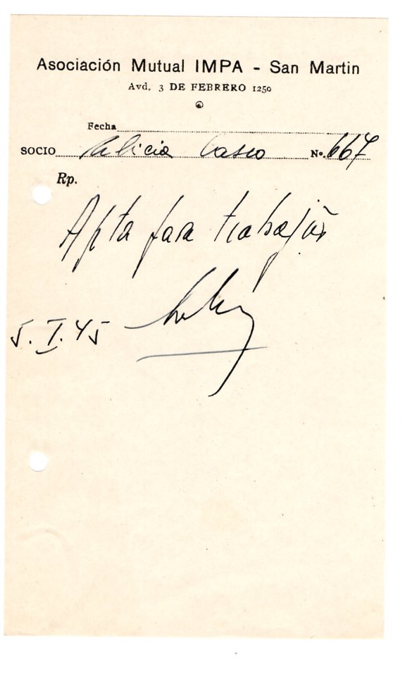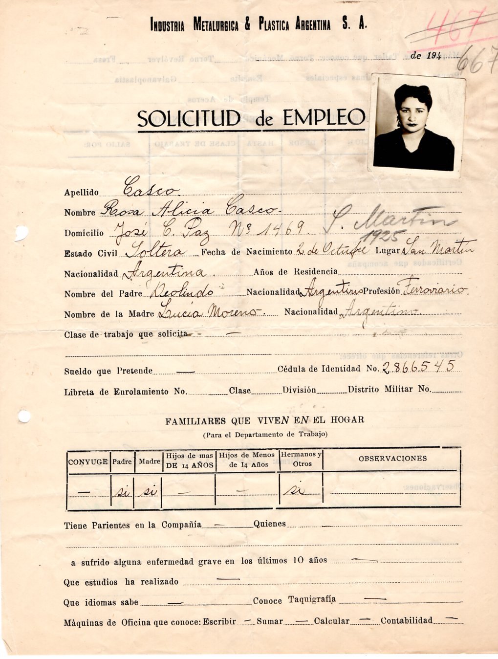 Rosa Alicia Casco trabajó como obrera de la fábrica IMPA durante la Etapa 1 de empresa privada (1928-1945) y Etapa 2 (1946-1960) empresa estatal.