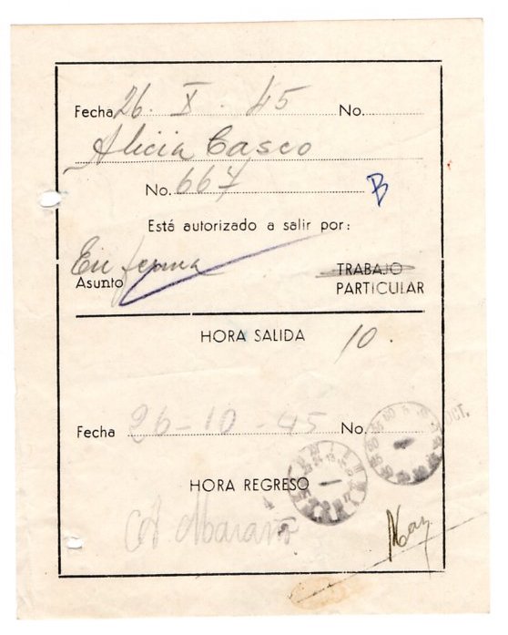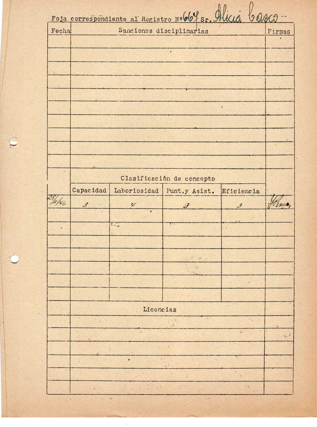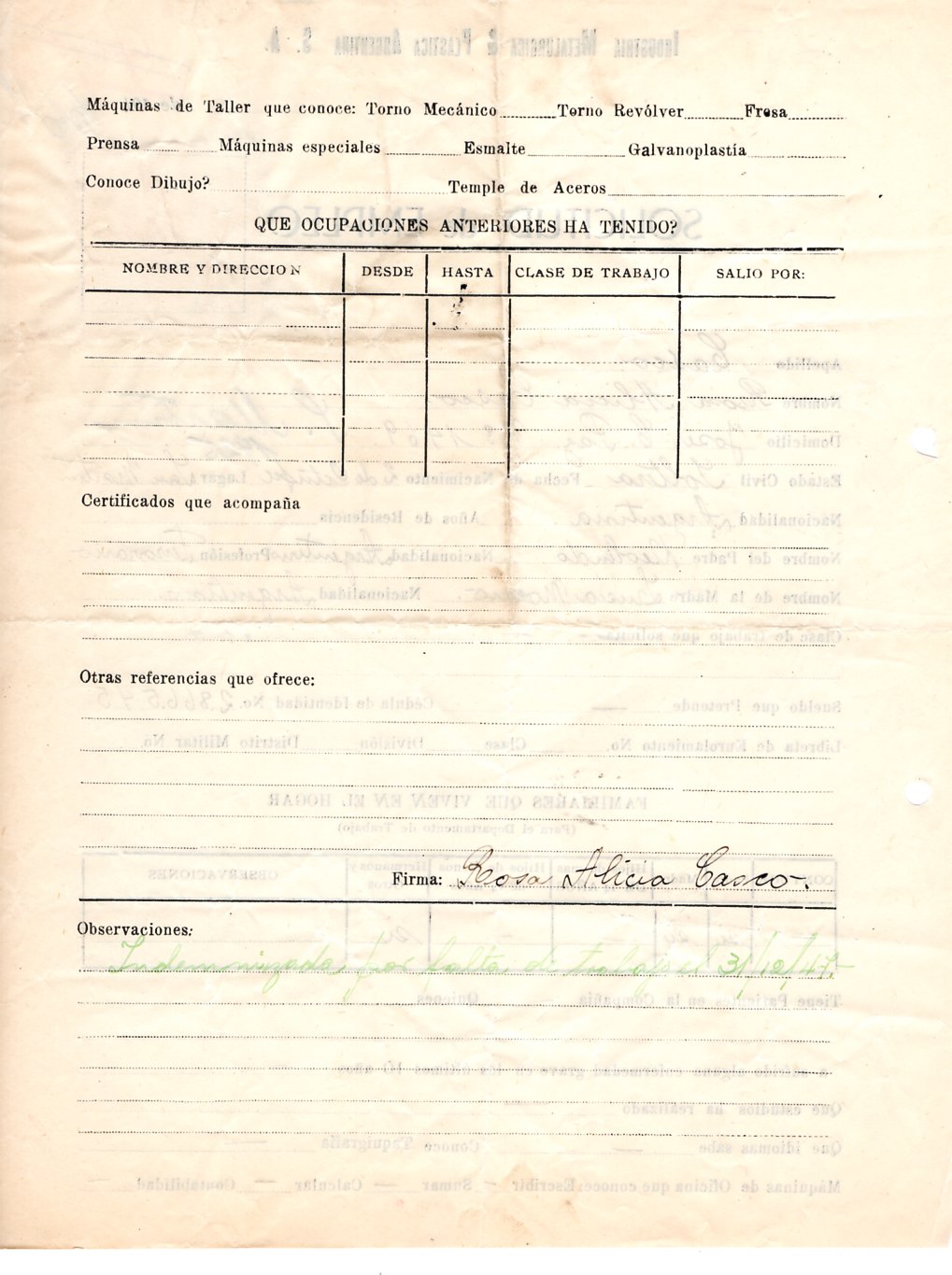 FECHA DE NACIMIENTO: 02/10/1925. EDAD AL INGRESO: 19 años. SEDE: San Martín. ÁREA DE TRABAJO: Munición. Encargada Sección Estira vainas. FECHA DE EGRESO: 31/12/1947. NACIONALIDAD: argentina. SUELDO INICIAL: 0,30 por hora. ESTADO CIVIL: Soltera. ESTUDIOS: Primarios. EMPRESA ANTERIOR: Sin mención (Seleccionadora).