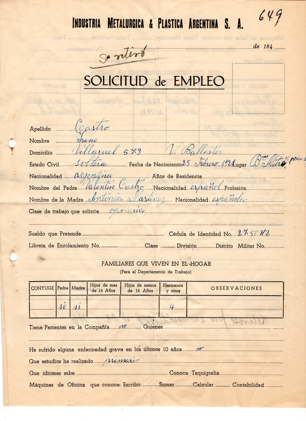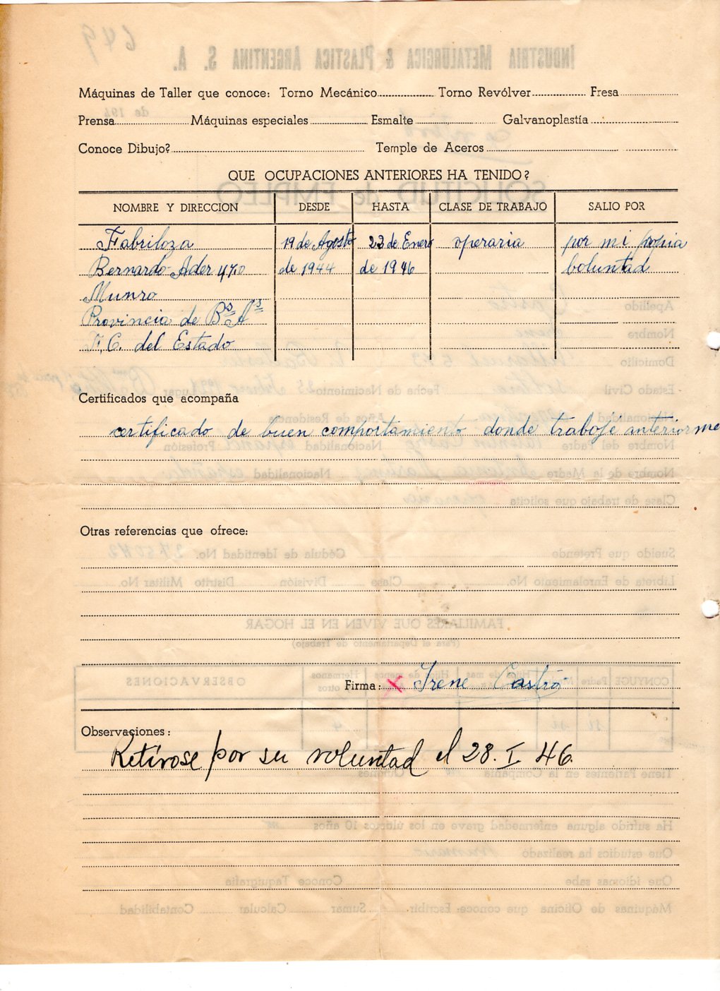 FECHA DE NACIMIENTO: 25/02/1921. EDAD AL INGRESO: 25 años. SEDE: San Martín. ÁREA DE TRABAJO: Munición. FECHA DE EGRESO: 28/01/1946. NACIONALIDAD: Argentina. SUELDO INICIAL: 0,30 por hora. ESTADO CIVIL: Soltera. ESTUDIOS: Primarios. EMPRESA ANTERIOR: Fabriloza (Munro).