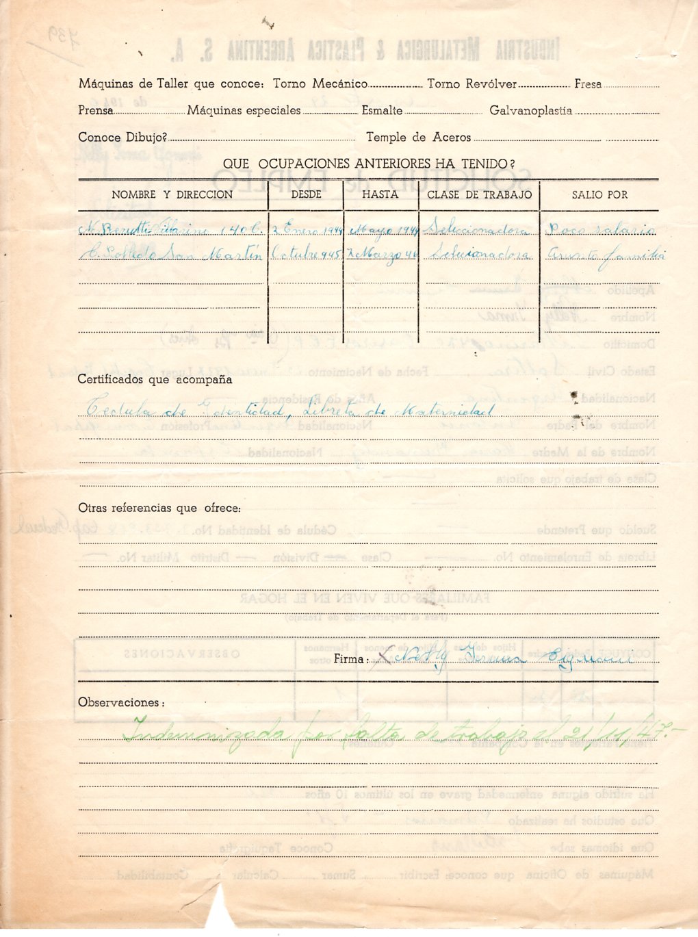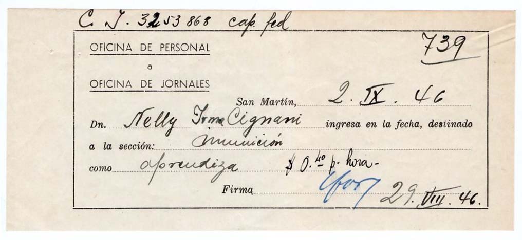 FECHA DE NACIMIENTO: 25/01/1927. EDAD AL INGRESO: 19 años. SEDE: San Martín. ÁREA DE TRABAJO: Munición. FECHA DE EGRESO: 21/11/1947. NACIONALIDAD: argentina. SUELDO INICIAL: 0,40 por hora. ESTADO CIVIL: Soltera. ESTUDIOS: Primarios. EMPRESA ANTERIOR: Sin mención (Seleccionadora)
