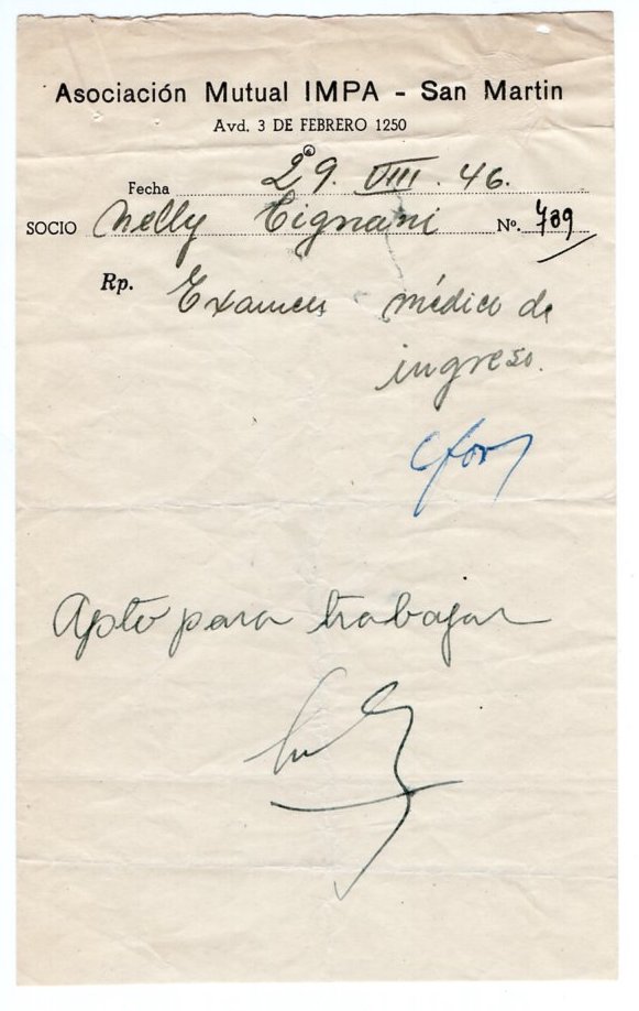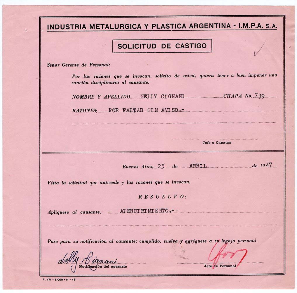 Cignani Nelly Irma trabajó como obrera de la fábrica IMPA durante la Etapa 1 de empresa privada (1928-1945) y Etapa 2 (1946-1960) empresa estatal.
