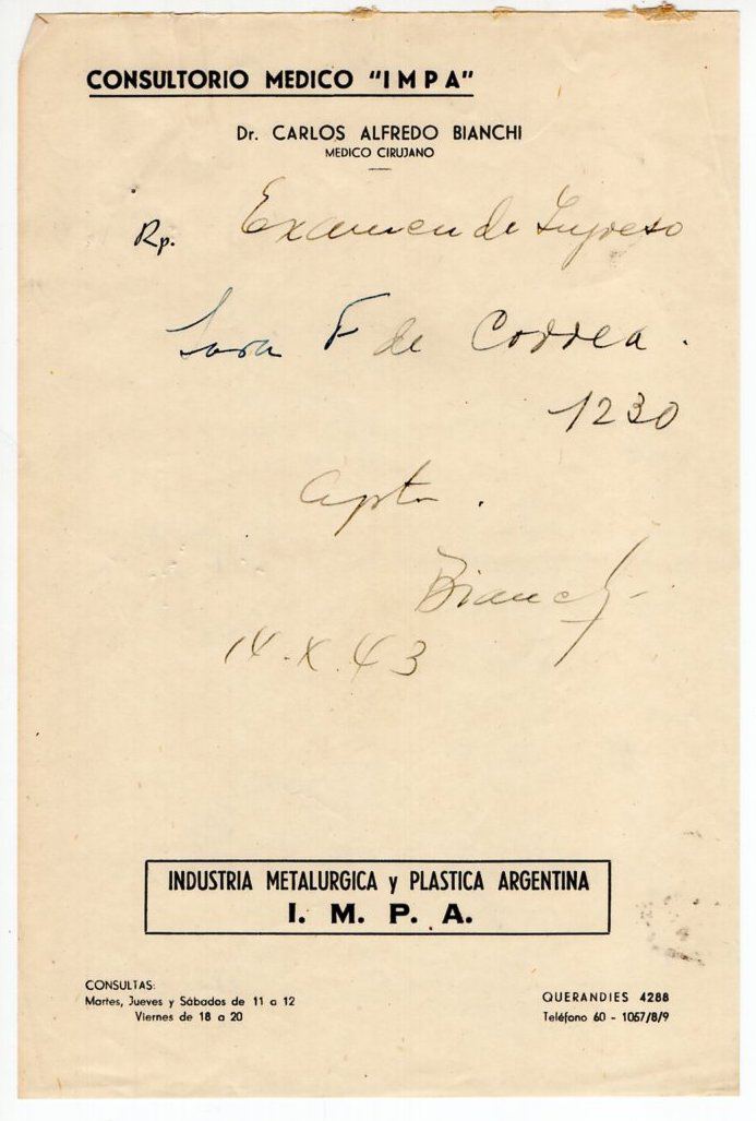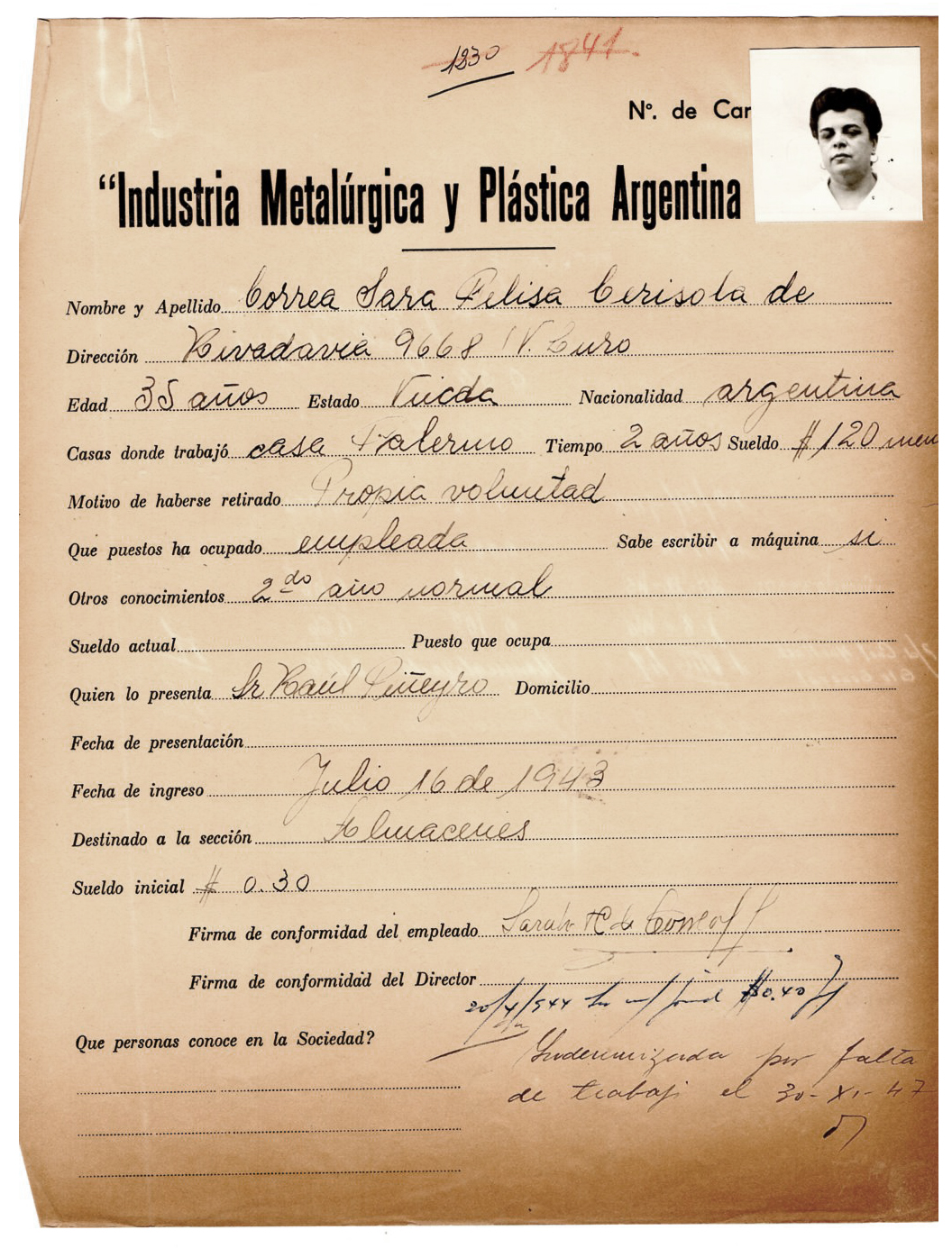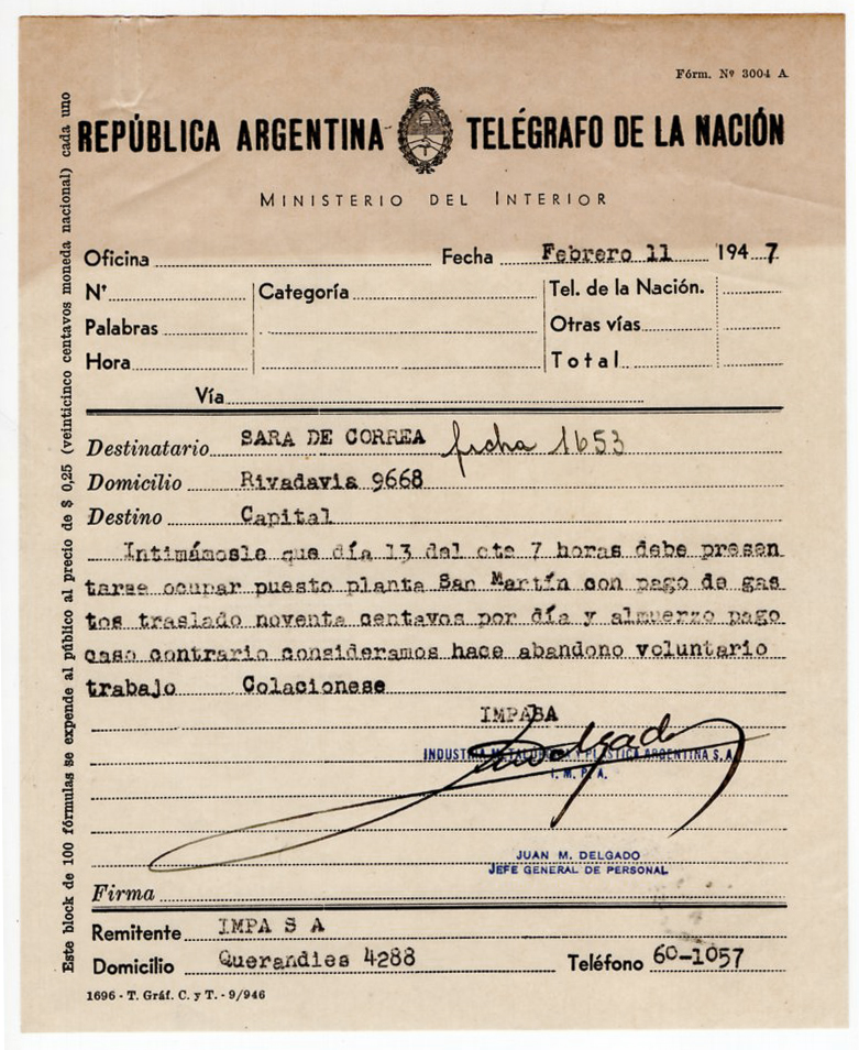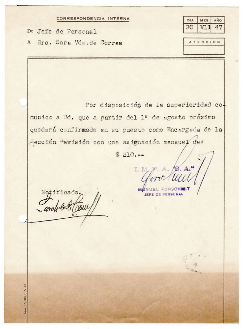 Sara Felisa Correa de Cerisola trabajó como obrera de la fábrica IMPA durante la Etapa 1 de empresa privada (1928-1945), la Etapa 2 (1946-1960) empresa estatal.