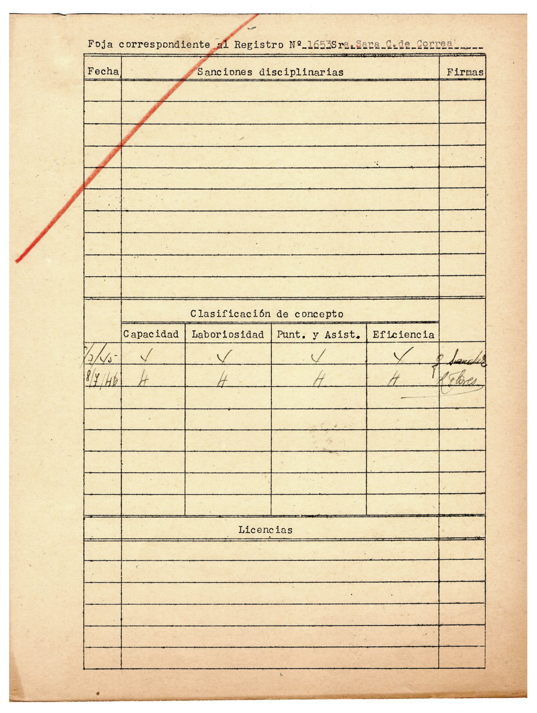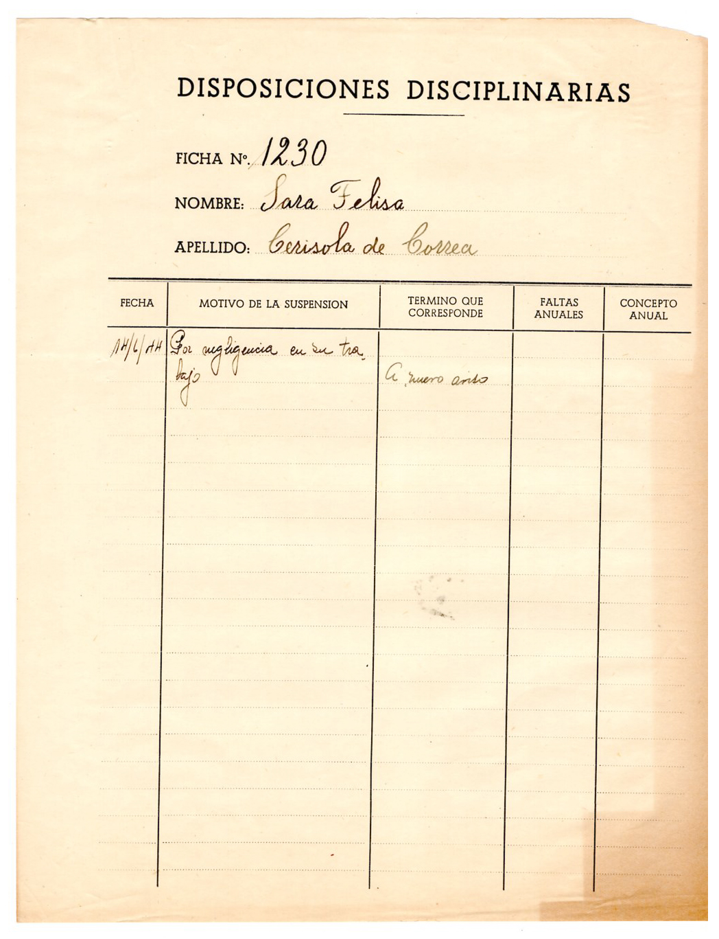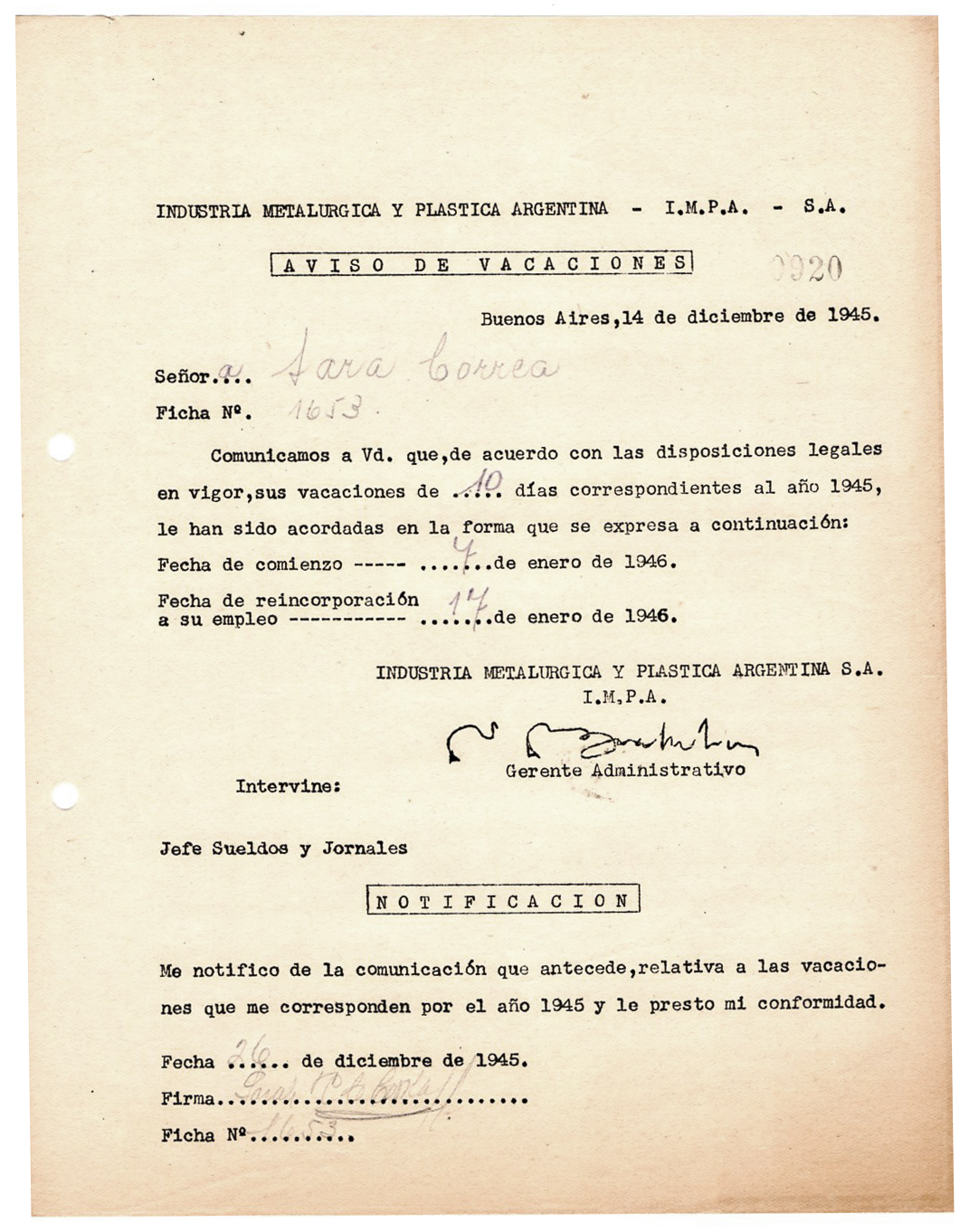 Sara Felisa Correa de Cerisola trabajó como obrera de la fábrica IMPA durante la Etapa 1 de empresa privada (1928-1945), la Etapa 2 (1946-1960) empresa estatal.